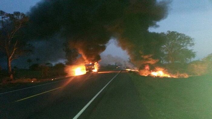 El camión ya incendiado fue grabado por un conductor que transitaba por la ruta minutos después.