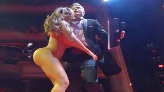 Pero lo que hizo que se ganara el aplauso del público, fue cuando su nombre fue pronunciado por el conductor español Iván Madrazo, para que hiciera su pasarela. Al subir al escenario, la música hizo que la cuerona empezara a menear su cuerpo de manera provocadora, se acercó al presentador y se puso a franelearlo.