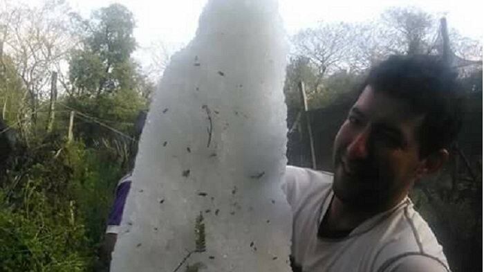 Tulio Matto, intendente de la localidad, contó que el enorme bloque de hielo cuya imagen se viralizó en las redes es verdadero, que fue acumulado en un telón que resguardan las huertas, logrando así formarse más de un metro y pesando casi 30 kilos. “Nosotros guardamos un bloque en la heladera de la Municipalidad”, contó el jefe de la Comuna.