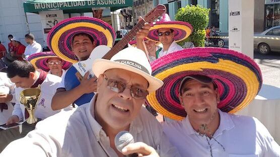 Julio González Cabello se despertó temprano ayer para ir al centro de Asunción y ser el animador de la famosa carrera de mozos. El relator peloteril estuvo posando con los diversos mozos de distintos bares que se presentaron.