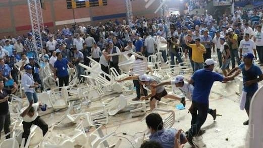 Haku voi hína dentro del coliseo “El Cerrito”, un feroz polideportivo en Coronel Oviedo, y a eso se le sumó el ambiente caldeado entre “efrainistas y llanistas”. La convención debió iniciar a las 10:00, pero el presi azul inició con las palabras de bienvenida 15 minutos antes de lo previsto. Upépe lomitã empezó a empujarse y de repente nomás ya se veían volar las sillas de un lado para otro. Heta oñembuepoti lomitã, hasta que pasó el disturbio. El encuentro continuó de manera tensa con temas bastantes delicados a tratarse, donde ganó la propuesta de Efraín Alegre: ir por la alianza y no por la concertación en las elecciones presidenciales del 2018.