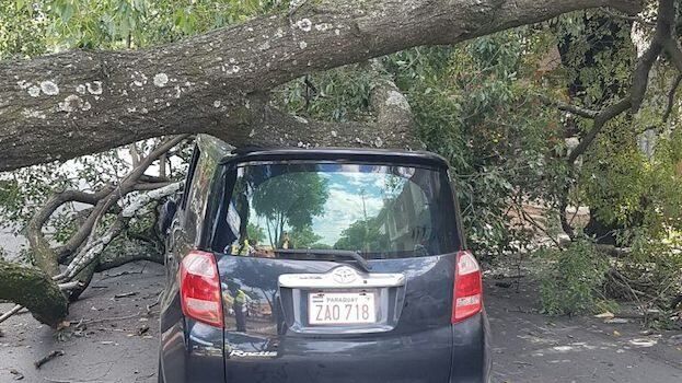- Un viejo árbol de tajy aplastó un vehículo y sus ocupantes salieron ilesos