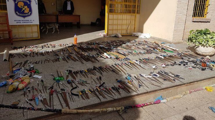 Una nueva, sorpresiva y tempranera verificación sorprendió a los reclusos de la Penitenciaría Regional de Concepción, donde policías antinarcóticos, milicos expertos en cuestiones explosivas, guardiacárceles y agentes del Ministerio de Justicia lograron lo que podría ser una de las mayores incautaciones de armas blancas elaboradas por los internos, totalizando estas alrededor de ¡500 unidades! En el stock hay machetillos, estoques y cuchillos de los más diversos tamaños y formas. Pero el tema no terminó ahí, también pillaron a bulto dosis de crack y una laaarga soga elaborada con sábanas, aparentemente en un nuevo plan fallido de fuga.