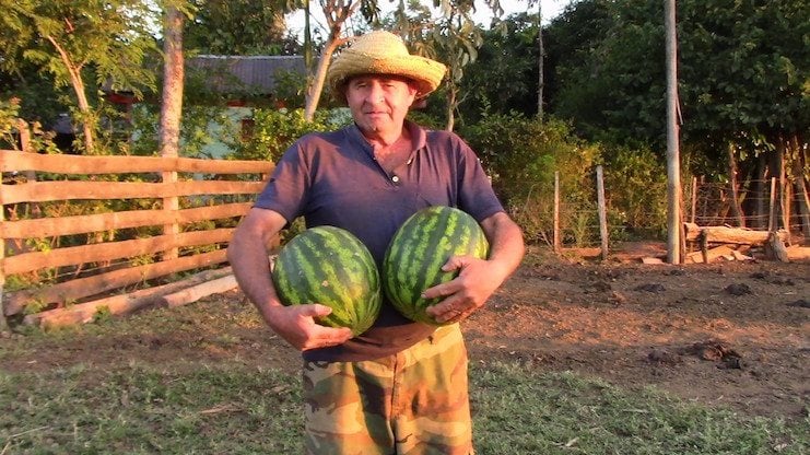 Eladio Mendoza es un pequeño productor de sandía del barrio Fátima de la compañía Yvaroty, distrito de San Pedro de Ycuamandyyú, departamento de San Pedro, que cuenta actualmente con una gran cantidad de producción de sandía, a pesar de que no es la época natural de producción de la dulce fruta.
