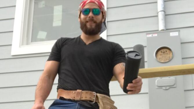 Vestido con mameluco y cinturón para herramientas, el “Pelado” se encarga de hacer laburos de carpintería y montajes de casas.