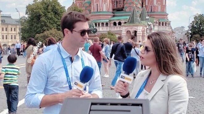 PLAZA ROJA. Nico Lithix y Soledad Franco en la Plaza Roja desde donde hacen la previa al Mundial.