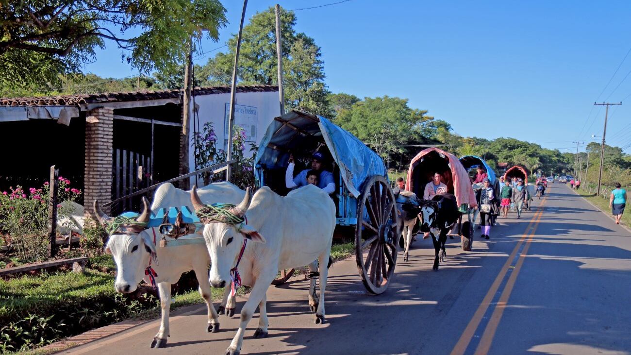 Todos acuden ya sea caminando, en colectivos y en el caso de don Isabelino Solalinde (50), a bordo de su carreta tirada por bueyes, una práctica que se volvió tradicional en varias familias de Yaguarón hace mucho tiempo.