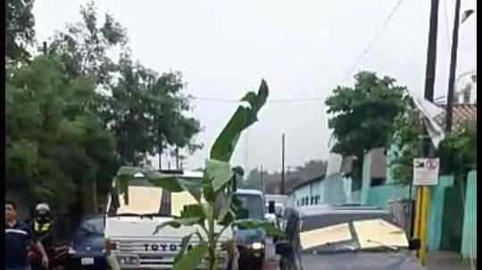 Vecinos de la zona de Barcequillo, con carteles y sin importarles la cantidad de agua que había por la calle, salieron a protestar por la sitú, y como forma de llamar la atención plantaron árboles de banana en los enormes cráteres que se encuentran en esa zona.