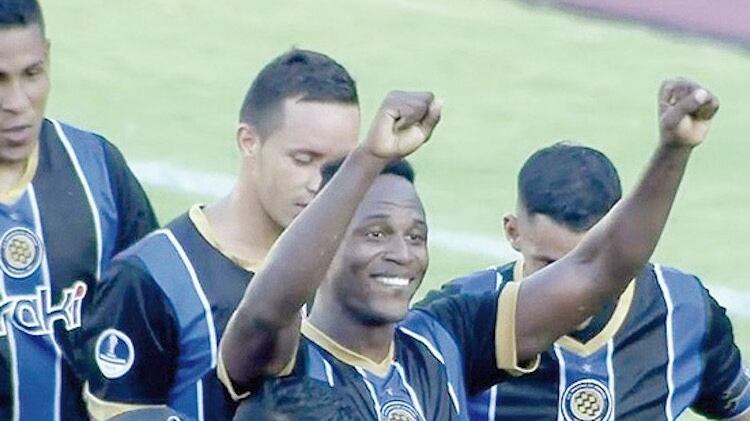 Cuero, con los brazos en alto festeja el gol del triunfo de Mineros.