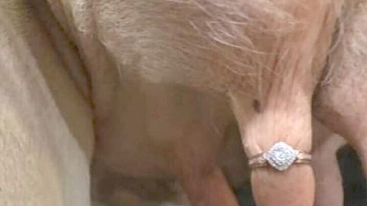 La imagen se viralizó rápidamente, en ella se observa un anillo de diamantes colocado cuidadosamente en la ubre de una vaca, acompañado de la inscripción: “Si mis globos oculares se ven forzados a sufrir por estas tonterías, los arrastro a todos conmigo”.