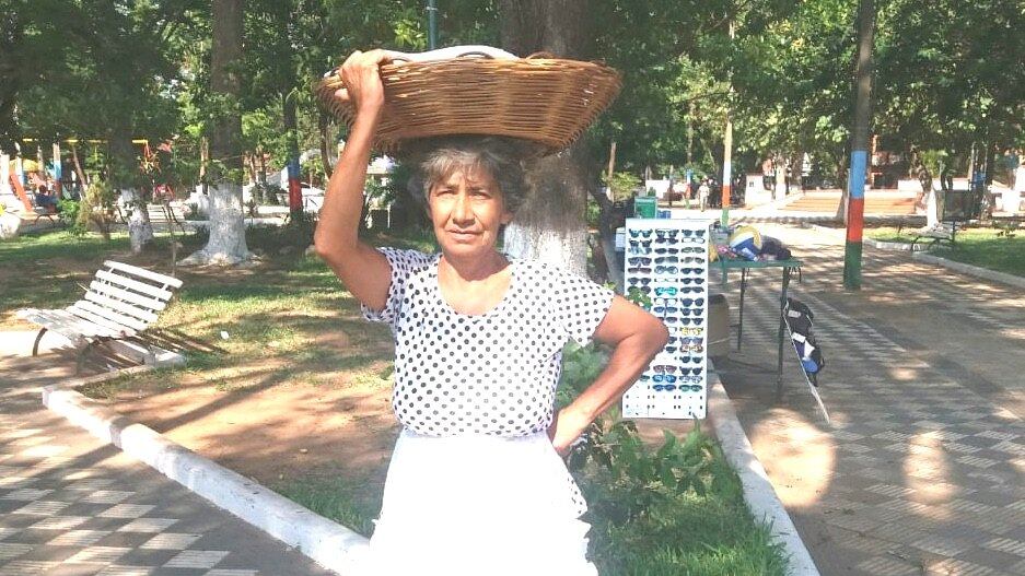 Damiana Moreira, de 63 años, es oriunda de San Lorenzo, pero por circunstancias de la vida se mudó y vive ahora en la ciudad de San Pedro de Ycuamandyyú, en el departamento de San Pedro, y según comentó hace 17 años que se dedica a vender chipa por las calles de esta ciudad y que constituye el principal sustento de su familia.
