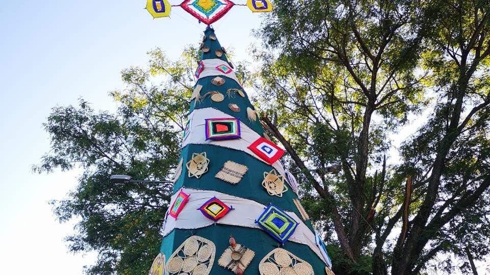“Está hecho con telas de 150 metros para los tejidos y 70 metros de lienzo, además de 12 mil lucecitas para darle el toque navideño”, omombe’u a Crónica María del Carmen Benítez, intendenta de la ciudad. Cada una de las artesanías que lo adornan fue hecho por artesanos mbya.
