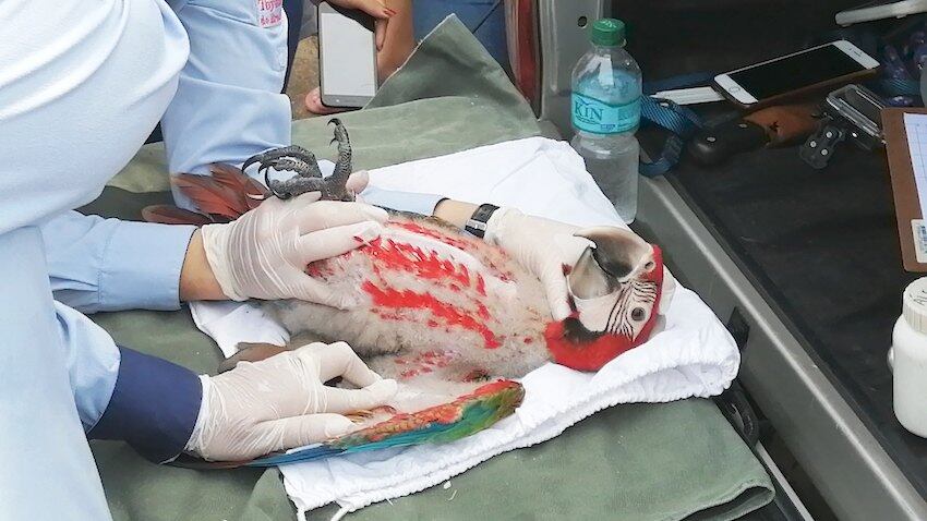 Un carro de los bomberos voluntarios fue utilizado para llegar hasta el nido de los guacamayos, de donde fue bajado el ta’yra’i para ser sometido a varios estudios por los especialistas venidos de rapailandia, encabezados por la especialista en aves, la doctora Neiva Guedes, además de las biólogas Larissa Tinoco y Eliza Monse, quienes también forman parte de la comitiva.