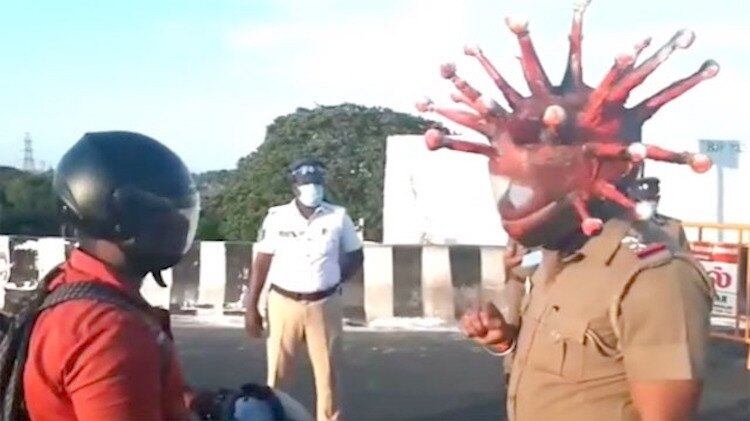 Como buen “zorro” la tarea de Rajesh Babu es ponerse cada jornada su “terrorífico” casco, con forma de coronavirus, e informa de esta “guisa” a los transeúntes y conductores que pasan por su puesto de control, en una avenida de la capital del estado de Tamil Nadu, al sur del país.