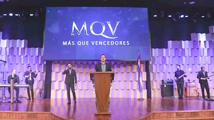 El pastor predica en la iglesia “Más que vencedores”.