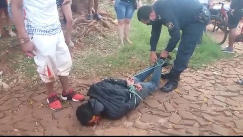 A tongo y a socos los vecinos redujeron al malviviente y una vez que ikane’óma lo ataron de pies y manos, como si fuese un regalo. Posteriormente, “el presente” lo entregaron a la Policía. Momentos antes, el hombre fue pillado intentando despojar de sus pertenencias a Juan Bautista Quintana, Jhonatan David Quintana y Shirley Espínola, quienes se sumaron al ñembuepoti. El motochorro fue identificado como Cristhian Ariel Benítez Vergara, de 25 años, domiciliado en el barrio Fátima.