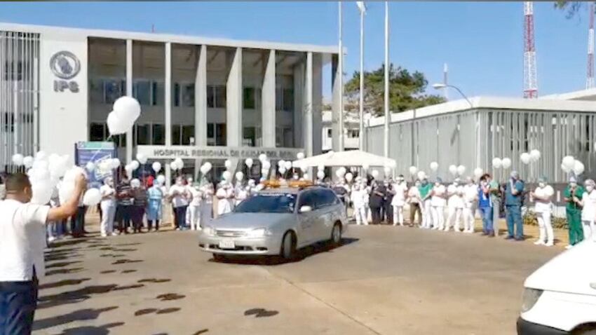 Los funcionarios de blanco del hospital de IPS de Ciudad del Este brindaron ayer una emotiva despedida a la licenciada Laura, minutos antes de que sea llevada a su morada final.
