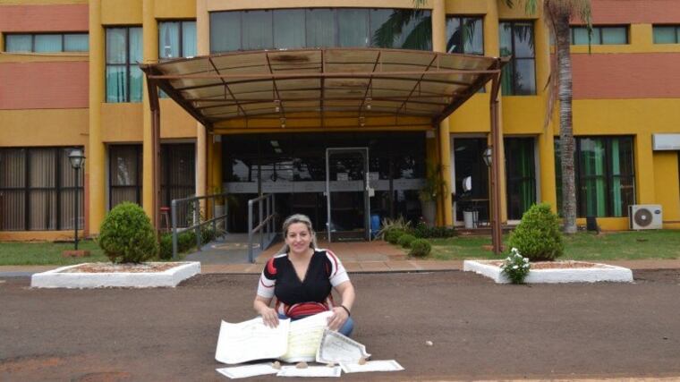 La profesional posó con sus diferentes logros en la mano frente al Rectorado de la Universidad Nacional del Este, lamentando la falta de oportunidades para la gente que se esmera en formarse en nuestro país.