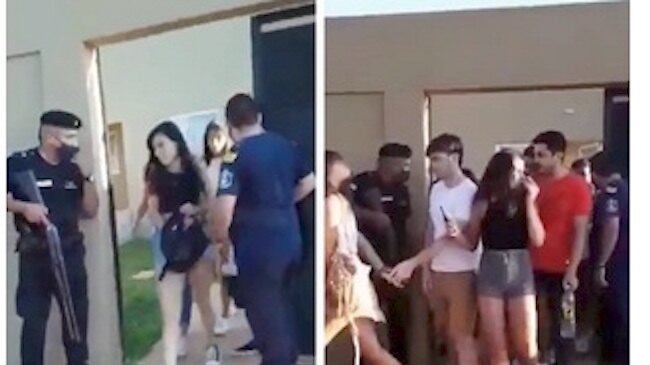 Un video se viral izó donde se ve en la entrada de una fiesta a dos policías, y una gran cantidad de péndex saliendo del lugar. Ocurrió en Corrientes, y ya estaba casi amaneciendo.