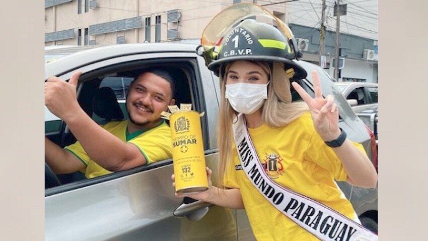 La Miss Mundo Paraguay 2021, Bethania Borba, con todo y banda de reina de belleza, se vistió de casco y remera amarilla para dar una manito a los bomberos participando de la “Colecta Anual Nacional de Bomberos Voluntarios”.
