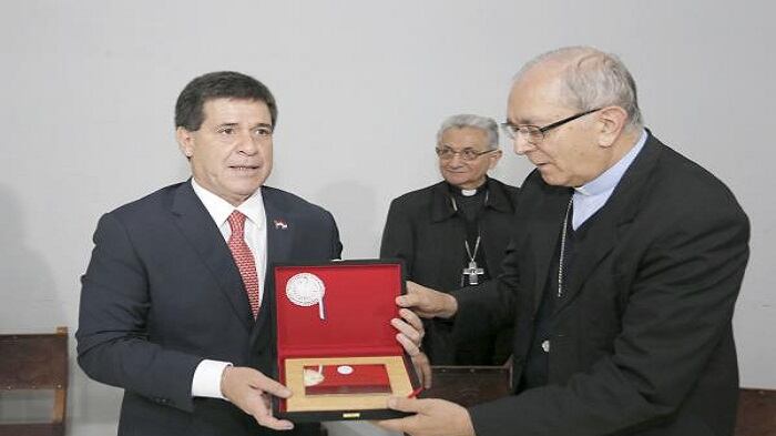 En la ocasión, Monseñor Edmundo Valenzuela, en su carácter de coordinador general de la visita del Papa Francisco y en representación de la Iglesia Católica, entregó al mandatario una placa conmemorativa en la que la CEP agradece el apoyo del Poder Ejecutivo y, en especial, al Presidente Cartes por contribuir al éxito de la gira papal.