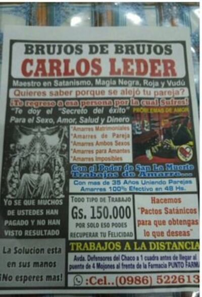 Carlos Leder se define como astrólogo y clarividente. Es colombiano. Llegó al país hace un año y explica el porqué eligió Paraguay. “El satanismo está instalado en Paraguay y cada vez más. Es por eso que nació en nosotros venir acá y comenzar a enseñar verdaderamente qué es, explicarles a las personas cómo combatir el satanismo”, dijo.