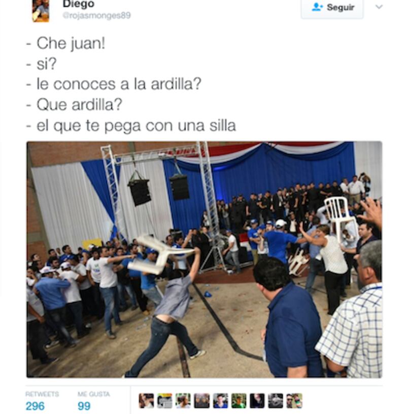 “Para la próxima, alquilen sillas de hierro. Así nos hacen un favor a todos. Gracias totales” he’i @TinoEguiazu. Mientras @BernardoFarina tuiteó “El liberalismo paraguayo está de pie (ya no quedan sillas)”. Otro de los tuits que se compartieron bastante fue el de @el_plagueonpy: “Actividad Paranormal en Convención Liberal... sillas flotando...” he’i, con una foto de las sillas por los aires.