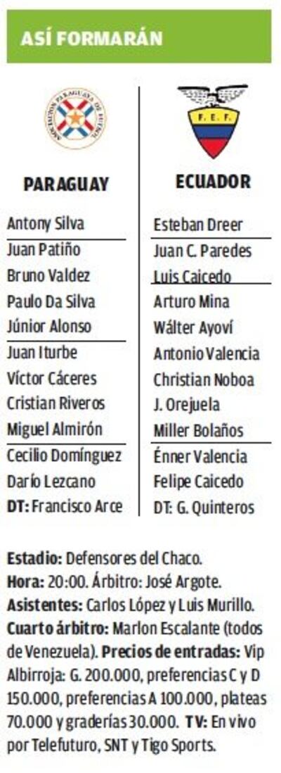 Con dos soldados de mil batallas en la mitad de la cancha, Cristian Riveros y Víctor Cáceres, el poderío ofensivo y veloz que prepara Arce tendrá que hacer sarambi de la defensa ecuatoriana para meternos de vuelta en la pelea. ¡A meterle garra y algo más!