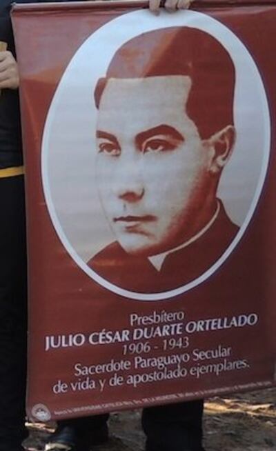 Julio Cesar Duarte Ortellado nació el 12 de abril de 1906, en Caazapá, en una familia acomodada. Desde muy chico se reveló en el pequeño Julio la sencillez de carácter que no le abandonaría en toda su vida. Ingresó en el seminario de Asunción a los 14 años, y estuvo allí durante seis años. A los 20 años viajó a Roma donde ingresó en el Pontificio Colegio Pío Latino Americano. El 27 de octubre de 1926 recibió su ordenación sacerdotal y al día siguiente celebró su primera misa sobre la tumba de San Pedro en la Basílica del Vaticano en 1931. Murió joven, a la edad de los 37 años, aquejado de una enfermedad llamada tifus, afección terrible que adquirió posiblemente por contagio, visitando a un soldado recién llegado de la guerra del Chaco. Todos lo que estuvieron la oportunidad de tratarlo aseguran que tuvo una vida digna y que se brindó para los demás.
