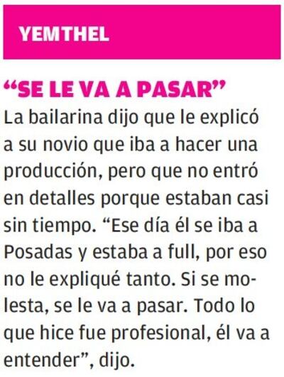 –Nosotros tenemos una relación liberal en cuanto al laburo. Pero siempre, en toda pareja, es bueno que se comparta un poco el dato de qué se va a hacer, por sobre todo si va a ser fuera de lo común como este trabajo. Yo no soy de prohibir, pero siempre le pido que sean cuidados los trabajos que haga. Más no te puedo decir sobre esto, porque primero tenemos que hablar.