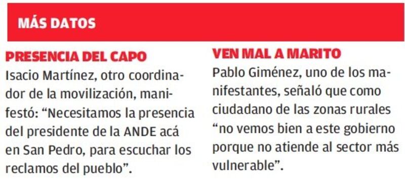SAN PEDRO. Miles de campesinos y usuarios de Administración Nacional de Electricidad (ANDE) de diferentes distritos del departamento de San Pedro, una vez más se movilizaron este lunes para exigir tarifa única y subsidio a las deudas con la hidroeléctrica, entre otras reivindicaciones.
