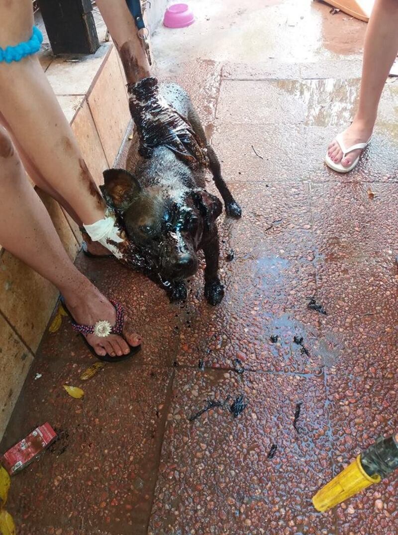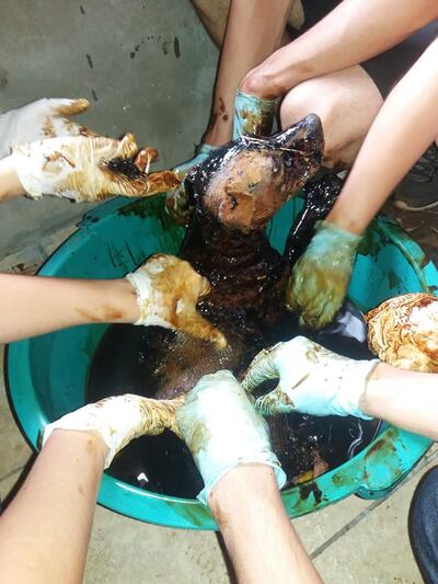 La perra fue llevada hasta la casa de responsable de Mymba Ñemohesãi y upépe los animaleros se encargaron de la limpieza de la pichicha. Con aceite comestible, aguarrás, papel diario y con mucha paciencia y amor empezaron la tarea de limpieza de la “cuatro patas”.