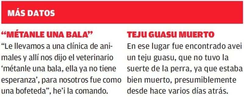 Ha upéi contó que “hicimos todo lo posible para no lastimar más al animal, luego les llamamos a los voluntarios de la Asociación Mymba Ñemohesãi. Una vez que la sacaron del pozo, le dieron de tomar agua, porque la perrita estaba mas sedienta que loperro después de Navidad. Había sido que estuvo unos 48 horas pataleando en el alquitrán”.
