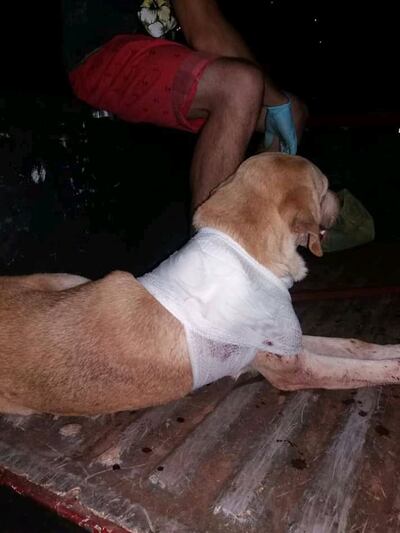 En la ciudad de Salto del Guairá, los bomberos voluntarios azules fueron llamados para socorrer a un perro que fue ¡apuñalado! por un karai y su hijo de 16 años, porque entró en su patio a cotejarle a su perra.
