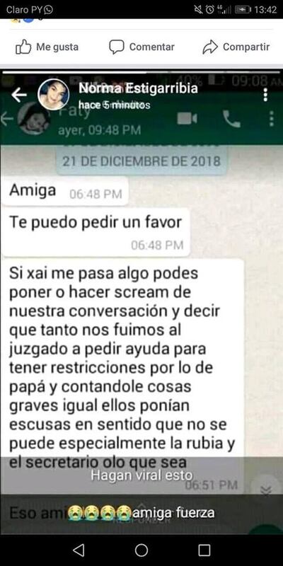 En un mensaje vía WhatsApp enviado el 21 de diciembre, a las 18:51, Fátima le pedía a una amiga que si algo les llegara a pasar que hiciera viral la conversación que mantuvieron en donde le dejaba en claro que fueron varias veces al juzgado a pedir restricciones en contra de su papá, pero aseguró que no le hicieron caso, ya que no se tomaron medidas al respecto.