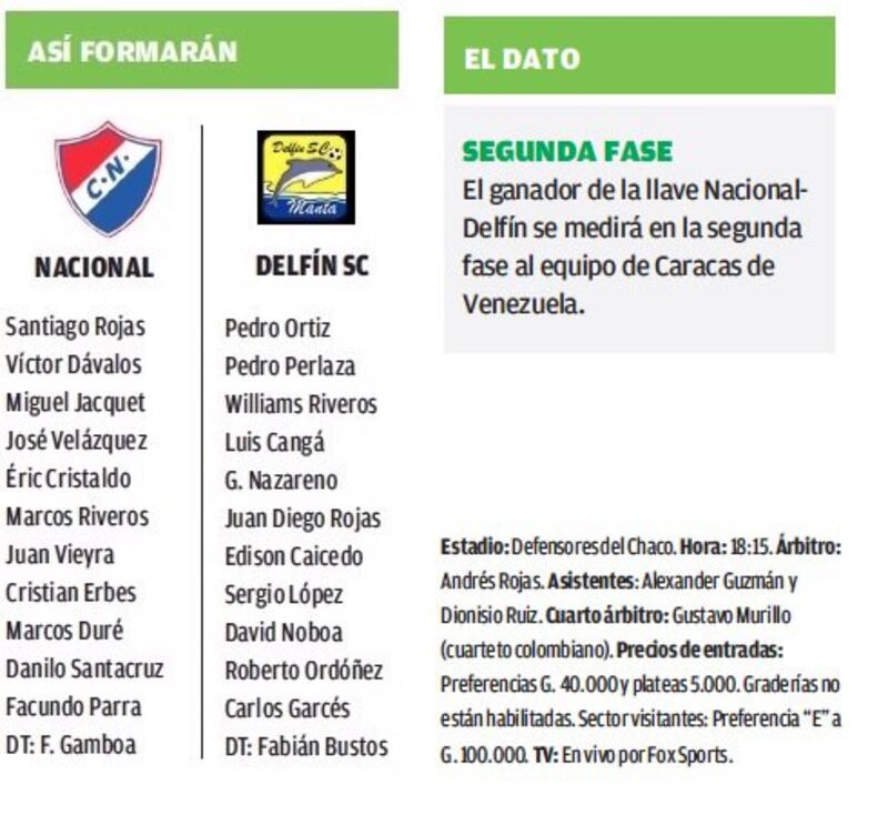 La realidad de Nacional está muy dura y hoy deberá jugarse la vida en la Copa Libertadores ante un Delfín de Ecuador, que llega inflado con los tres goles que le encajaron al equipo paraguayo. El compromiso corresponde a la vuelta de la primera fase de la Copa.