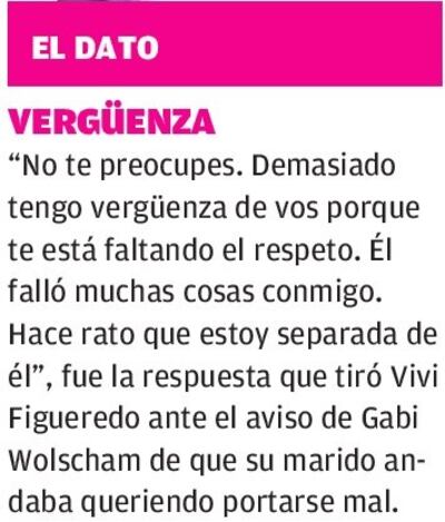 El chisme no cayó tan bien en la Wolscham que le escribió a Vivi: “Ocupate de tu marido para que no esté escribiendo y llamando en vez de inventar”. De esta manera, Gabi indicaba que al parecer Giancarlo Álvarez, marido de Vivi, le andaba especulando.