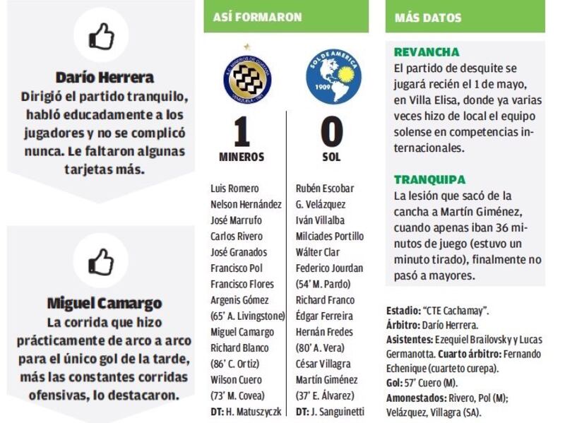 Mal debut. Y aunque 1-0 suena a poco, por lo que mostró Sol parece mucho. Y conste que Mineros no es que sea un Real Madrid, pero aún así fue superior en precisión y toque.