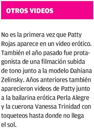 A través de grupos de WhatsApp se empezó a hacer tocorré un video erótico que supuestamente tiene como protagonistas a la farandulera Patty Rojas, conocida RRPP, y una reciente coronada Miss. El video de unos 16 segundos muestra a la modelo Rocío Adorno que se hizo conocida por acosar todito mal al cantante Prince Royce en Viña del Mar, junto a la farandulera besuqueándose desnudas.