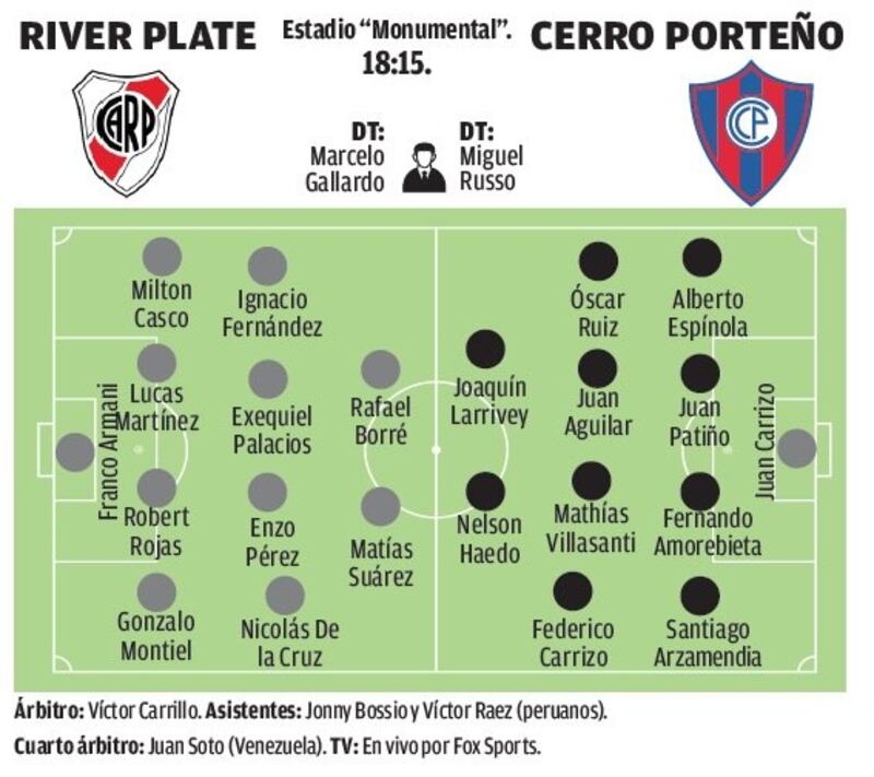 River Plate llega entonadísimo para el choque de hoy y con vueltas muy importantes de dos figuras: Ignacio Scocco y Javier Pinola. El DT Marcelo Gallardo tiene la duda si lo pone al paraguayo Robert Rojas o a Pinola, lo más cercano es que jugará Rojas, por su buen nivel en los últimos partidos.