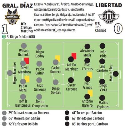 A los 23’ se armó la podrida: el árbitro Samaniego primero cobró tiro libre sobre la raya del área grande, pero uno de sus asistentes le avisó después que fue penal y Samaniego decidió pitar la pena máxima. Todos los jugadores de General Díaz se le fueron encima.