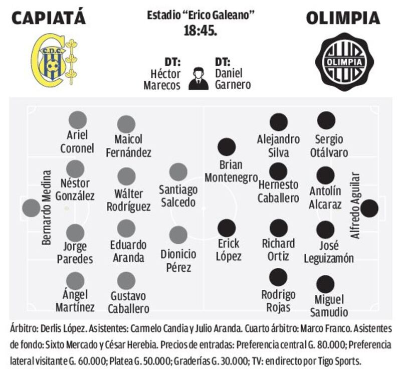 Choque duro por donde se lo mire. Por más que en la previa el gran favorito sea Olimpia (16 puntos) ante Deportivo Capiatá (8 puntos), por su condición de puntero, igual hay pronóstico reservado.