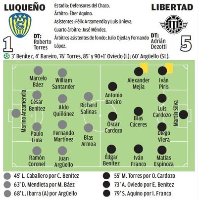 Con un “Demonio” encendido en el arranque, Libertad rápido se puso arriba. Primero le dijo a “Pájaro” Benítez “tomá, meté” y después fue él quien la empujó. Luqueño supo reponerse de estos dos mazazos, emparejó las acciones pero su fútbol no se tradujo en los goles para equiparar todo y eso lo pagó.