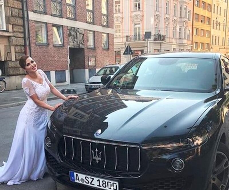 La novia llegando a la iglesia siendo ella misma su chofer. La misma empezó a mostrar que se casó nada menos que en Múnich, Alemania, llegando en un lujoso rodado y luciendo un vestido tipo princesa voi.