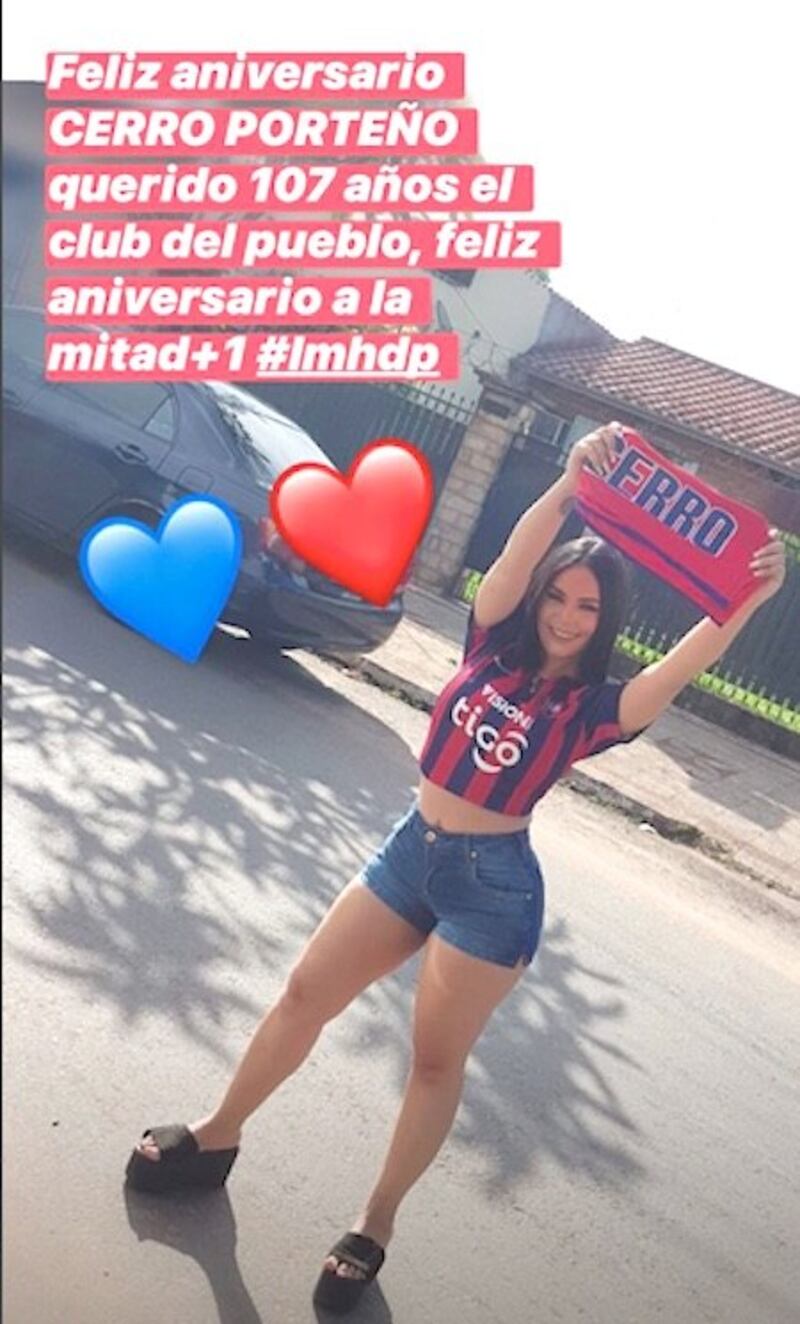 “Feliz aniversario Cerro Porteño querido, 107 años del club del Pueblo”, fue la dedicatoria que eligió la locutora sexy Seini Kim, a quien en cada partido de su club se la ve en la cancha.