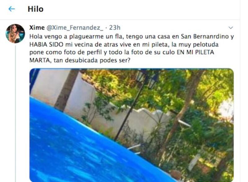 El Twitter en donde la usuaria @xime Fernández le mandó al frente a una joven por fotearse en la piscina de su casa de verano llegó incluso a Europa. El escrache terminó dando ñembo su fama a la mitãkuña que posó en biquini en la pileta ajena en San Bernardino.