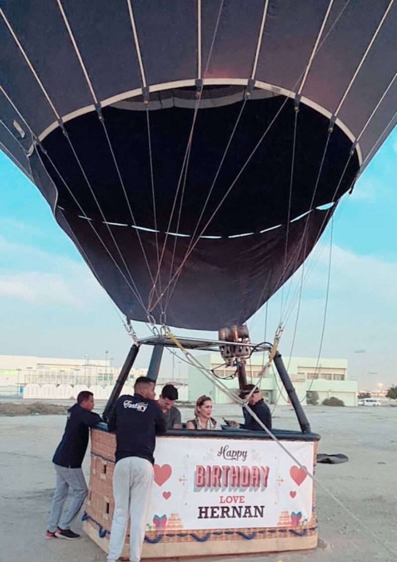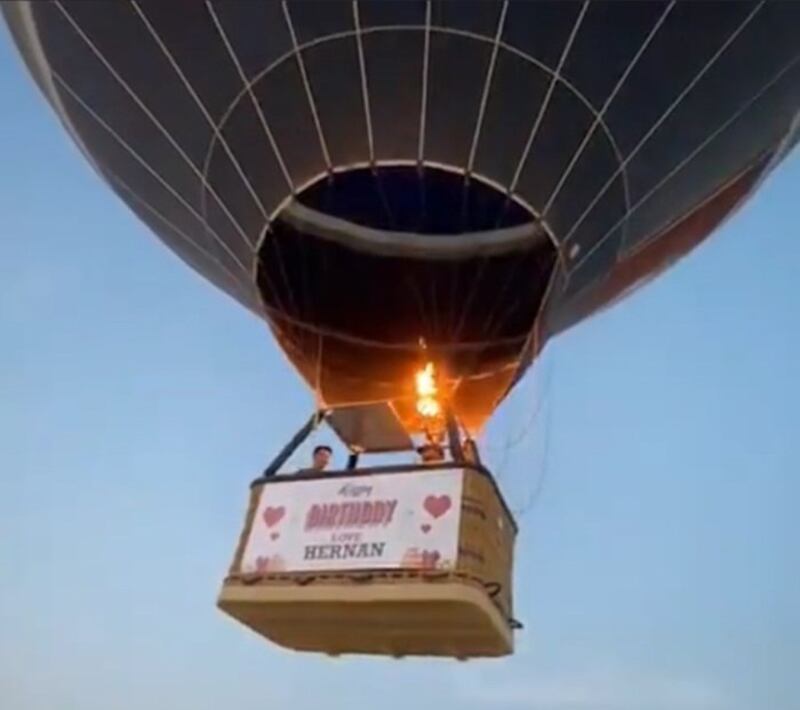 El delantero que chuta para el club Al Ahli, de Qatar, ayer llegó a los 31 calendarios y junto con su esposa Carol tuvieron un desayuno en medio del desierto hasta donde llegaron a bordo de un globo aerostático que tenía la frase: “Feliz cumpleaños. Te amo Hernán”. El regalo para Hernán fue hecho por su doña.