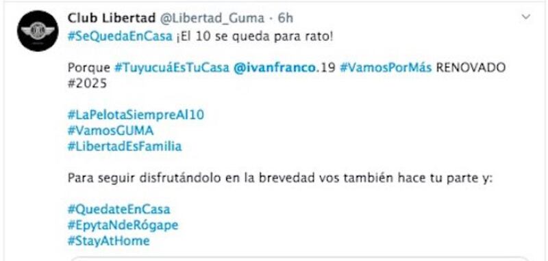 Iván, al igual que el resto del plantel de Libertad y todos los jugadores de Primera División, también está en cuarentena total, a causa del coronavirus. El peloterito se encuentra en su ciudad natal, Ybycuí, tomando todos los cuidados posibles para evitar el contagio. Al igual que todos, cumple una rutina de ejercicios ordenado por su club.
