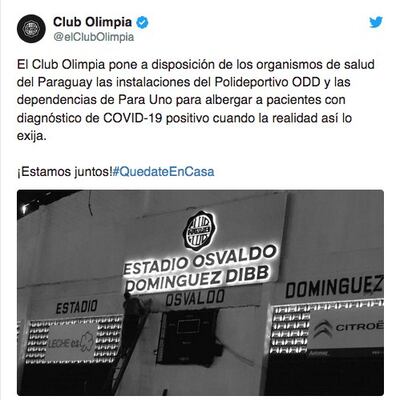 El Ciclón, por medio de su cuenta oficial en las redes sociales, puso que “en el caso de que sea necesario, Cerro Porteño pone a disposición del Ministerio de Salud las instalaciones del club del pueblo, para ser utilizadas ante una eventual emergencia sanitaria por el #COVID19. Paraguay nos necesita a todos y este partido lo ganaremos juntos”.