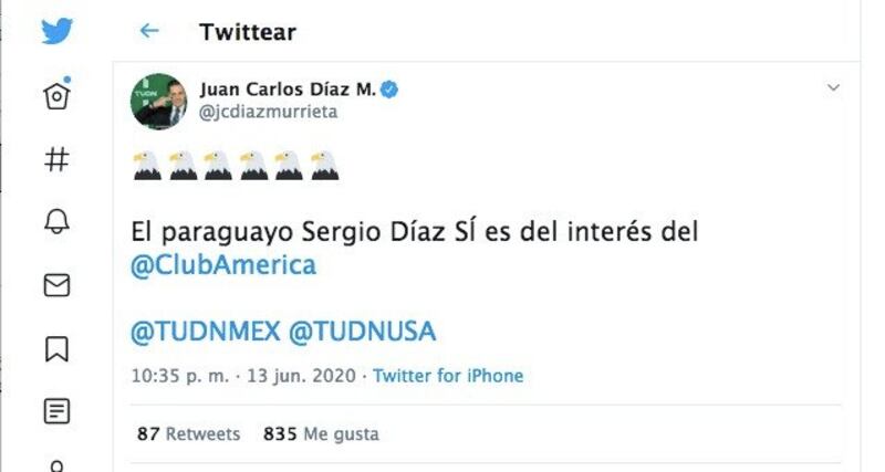 “E l paraguayo Sergio Díaz SÍ es del interés del @ClubAmerica”, le bajó a través de la red del pajarito.